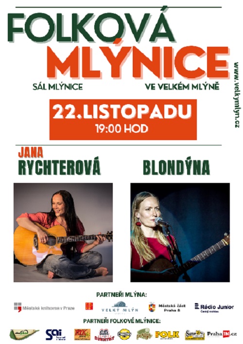 Nová scéna ve Velkém mlýně v Praze 8 Libni, Folková mlýnice, byla pokřtěna, první dva koncerty už tu proběhly a v listopadu a prosinci vás čekají další. Již příští týden ve středu 22. listopadu Folková mlýnice přivítá dvě písničkářky - Janu Rychterovou a Blondýnu.